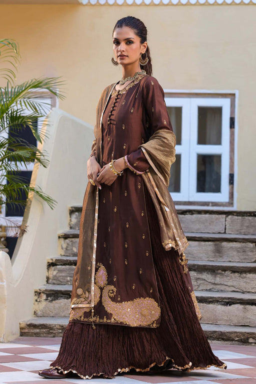 Deepika Chadha's stunning Brown printed chinnon fabric blouse, beautifully adorned with gold borders. The flowy brown georgette sharara, highlighte...