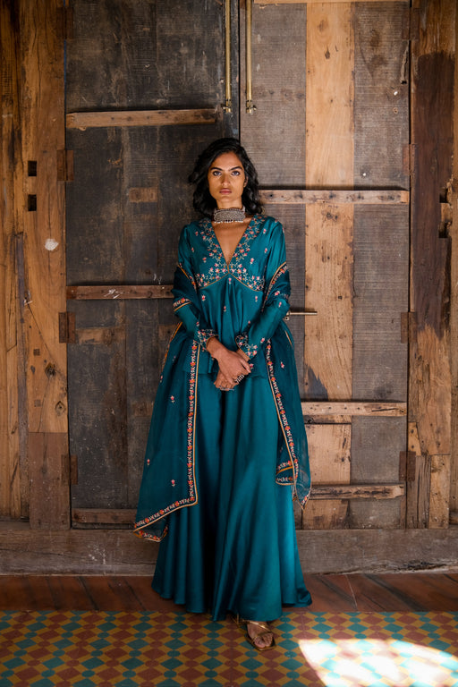View full detailsTeal thread embroidered circular Top Paired with flared sharara and silk organza thread embroidered dupatta Fabric : Top & Sharara - Silk Chan...