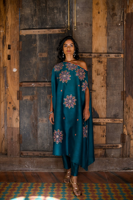 View full detailsTeal Off-shoulder tunic is thread embroidered using contrasting mutliple colors Paired with teal cigarette pants Fabric : Tunic & Pants ...