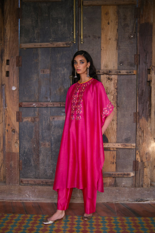 View full detailsFuchsia thread embroidered loose fit Tunic Paired with fuchsia wide leg pants and a separate short slip Fabric : Tunic & Pants - silk chande...