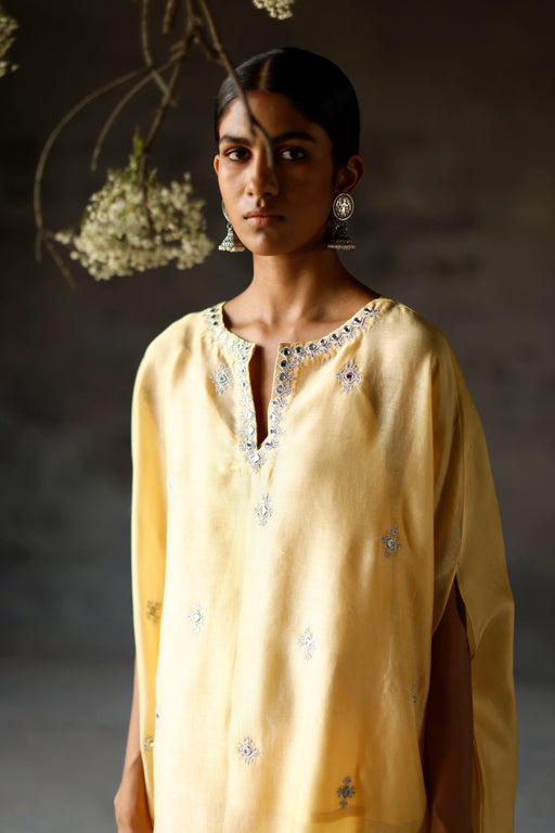 View full detailsYellow Silk Chanderi mirror embroidered v-neck Kaftan Worn with short cotton slip Paired with Silk cotton pants Fabric : Kaftan - Silk Cha...