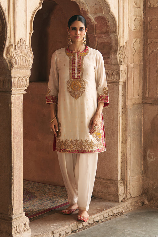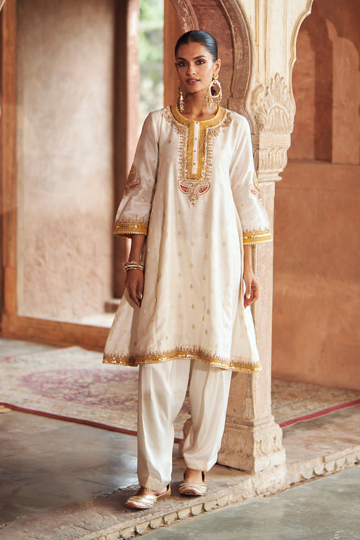 View full detailsA timeless kurta crafted in pure Silk Chanderi Banarasi, paired with a classic Dogri salwar. Featuring a zero neckline with placket and three-quart...