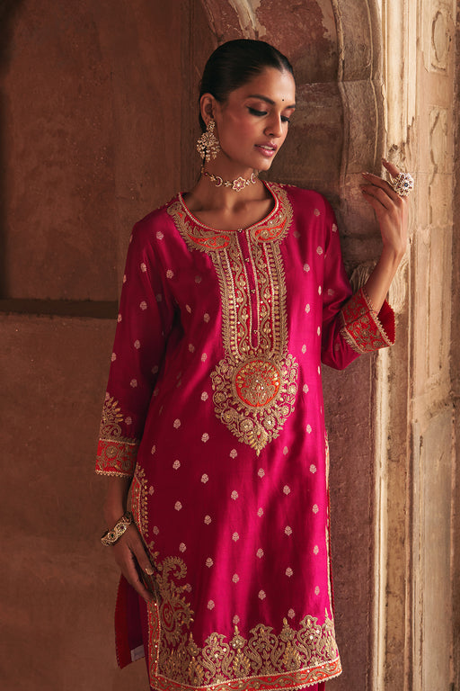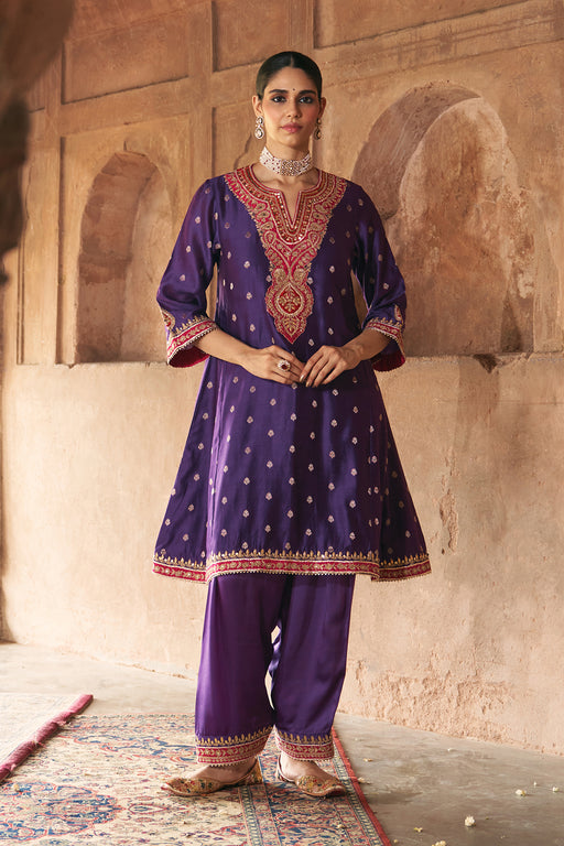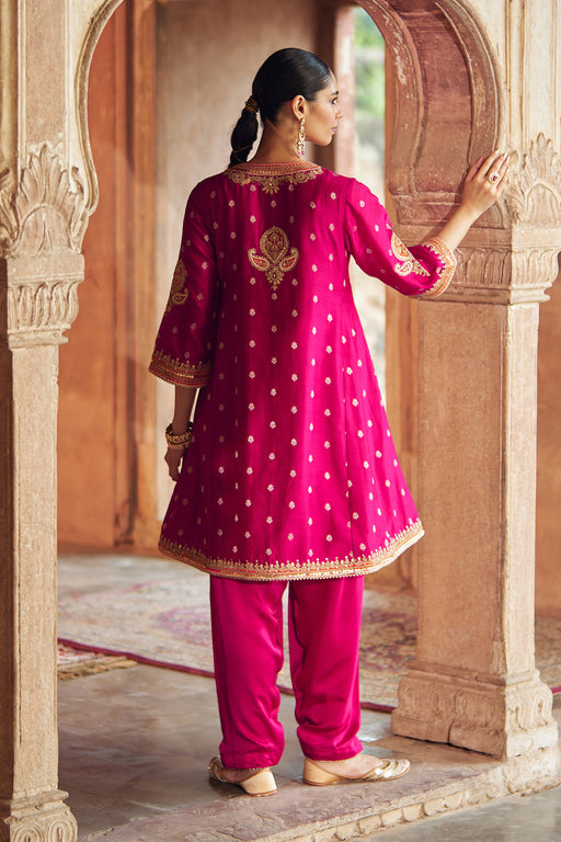 View full detailsA refined ensemble crafted in pure Silk Chanderi Banarasi, paired with a traditional Dogri salwar. The kurta features a zero neckline with placket ...