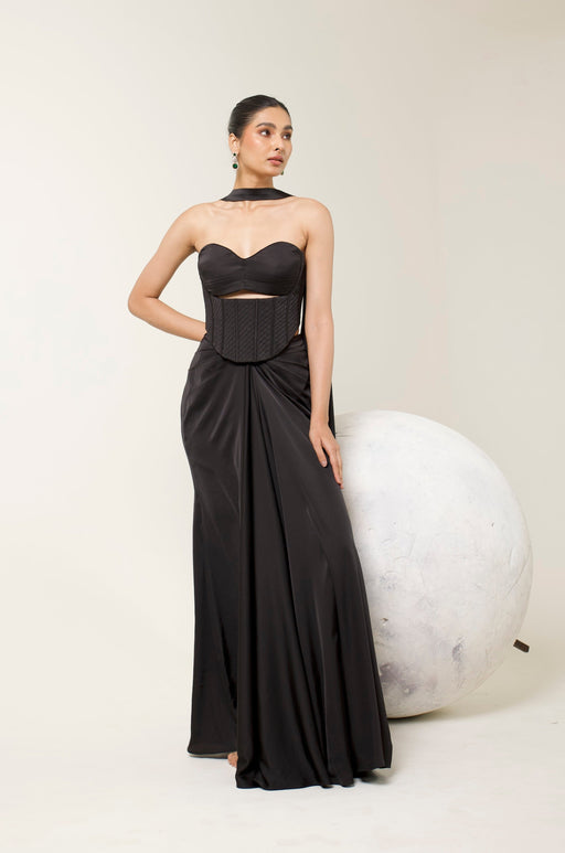 Command the spotlight in our black silhouette— a sculpted silhouette that marries structure with fluidity. Designed in luxurious fabric, the corset...
