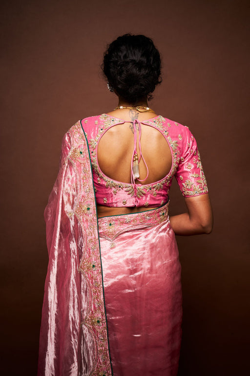 View full detailsDescription: This is a Taffy pink tissue blouse comes with intricate pearl and cut dana embroidery. Blouse Details: Color: Taffy pink Fabric: Tissu...