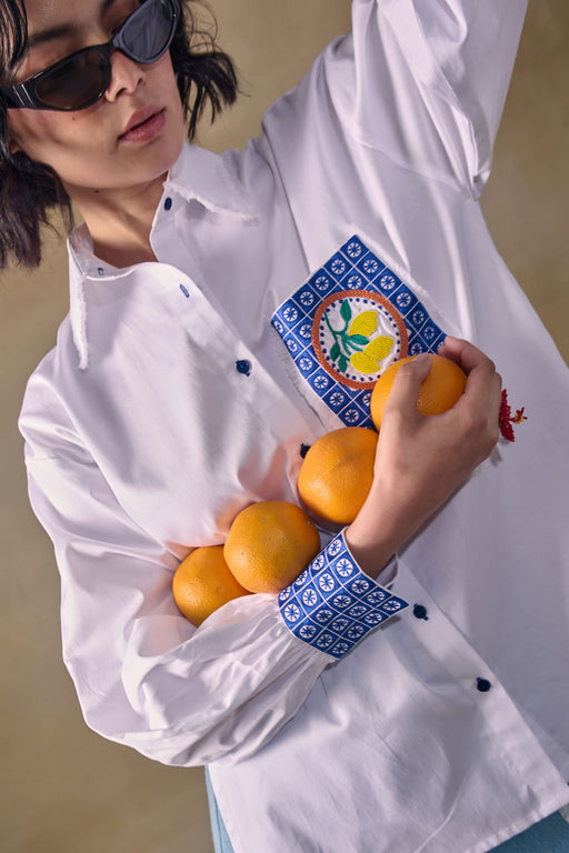 View full detailsAsilah white button down shirt with full sleeves, threadwork and beadwork embroidered pocket, cuffs and contrast buttons. Fabric- Cotton Satin Colo...