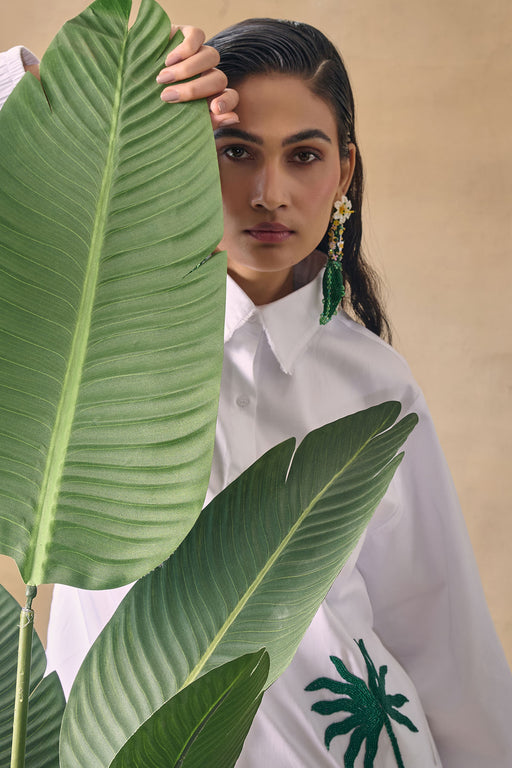 View full detailsAsilah white button down shirt dress with palm tree threadwork embroidery and high-low hemline. Fabric- Cotton Satin Colour- White Surface techniqu...