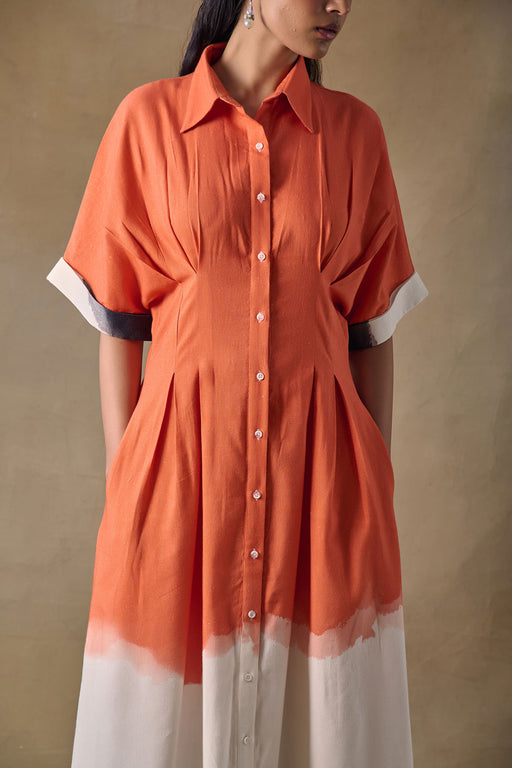 View full detailsHand drawn orange washed print Kimono dress with front button down opening and shirt collar with snatched waistline for a slimmer look. Fabric- Cot...