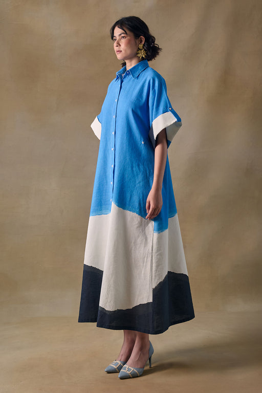 View full detailsHand drawn blue washed print button down dress with rolled sleeves and side button detail for multi-functional styling. Fabric- Linen Colour- Blue ...