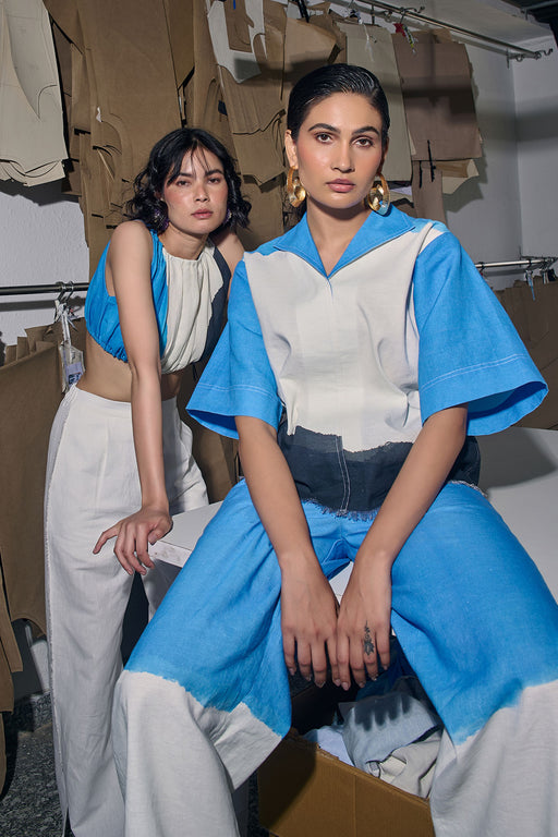 View full detailsHand drawn blue washed print gathered blouse with a halter neck and back button detailing. Fabric- Linen Colour- Blue Wash Surface technique- Print...