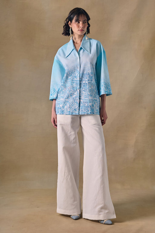View full detailsHand drawn blue landscape print button down shirt with relaxed 3/4th sleeves and a long collar. Fabric- Cotton Flex Colour- Blue Landscape Surface ...