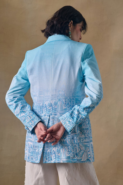 View full detailsHand drawn blue landscape print single-breasted blazer with a notched collar. Fabric- Cotton Flex Colour- Blue Landscape Surface technique- Printed...
