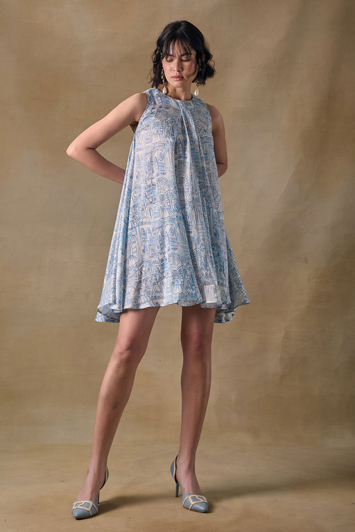 View full detailsHand drawn blue landscape print halter neck mini dress with hook and eye closure at back neck. Fabric- Modal Satin Colour- Blue Landscape Surface t...