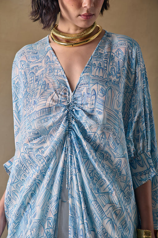 View full detailsHand darwn blue landcape print kaftan with adjustable drawstring for multipurpose styling Fabric- Modal Satin Colour- Blue Landscape Surface techn...