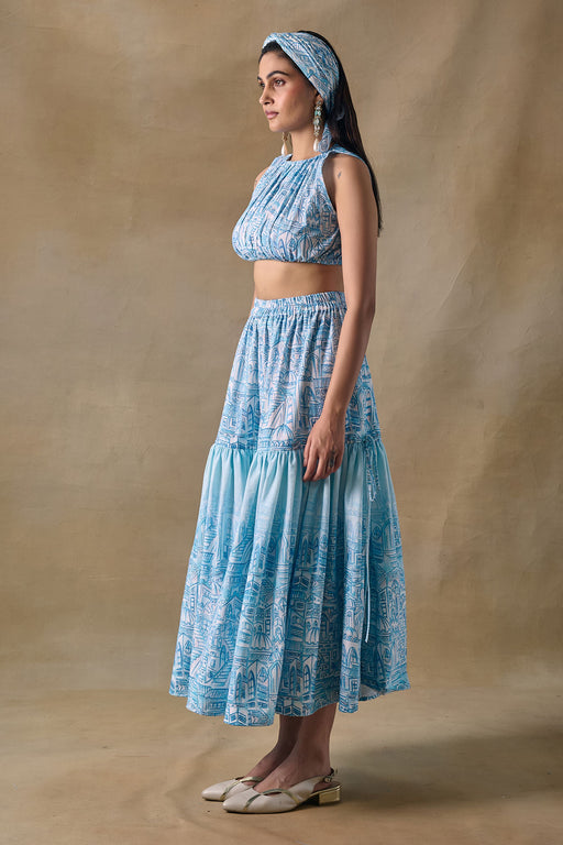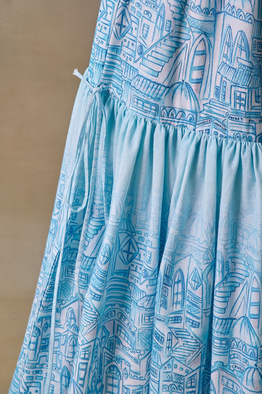 View full detailsHand drawn blue landscape print tiered midi skirt with a drawstring detail for mutli-functional styling. Fabric- Cotton Flex Colour- Blue Landscape...
