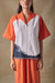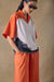 Hand drawn orange washed print, relaxed fit kaftan top with lapel collar, short sleeves and fringed hem.