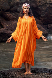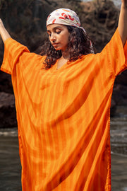 The Angela kaftan is made from our softest of cotton silk fabrication with hand painted stripe print. It is a free size kaftan with slits & pockets.