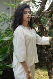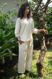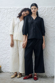 Missu coord set is made from our yarn dyed linen cotton fabrication. The top is a short sophisticated V neck blouse with a delicate sleeve.