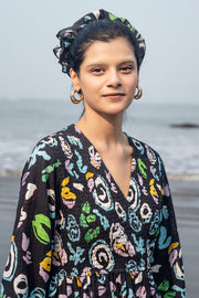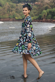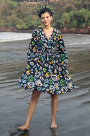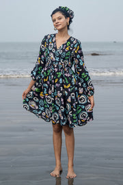 The savi dress is made from our cotton chequard slub fabric with hand painted embroidered floral print. The upper part of the dress is made through smocking detailing.