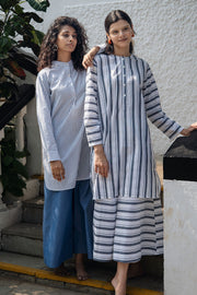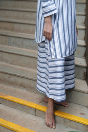 Uniqlo set is made from our madras yarn dyed striped fabric in blue and white colour. The kurta is a anti fit short kurta paired with flaired pants makes it perfect for a hot summer.
