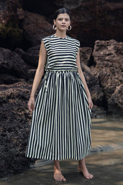 Wrap skirt set is made from our cotton linen fabrication in striped print. It has a bib top paired with a wrap skirt.