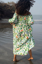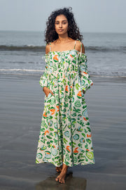 The zoe dress is made from our linen cotton fabrication in our hand painted floral print. It has a tie up detailing at the shoulder with dropped sleeves and fagotting detailing under the bust.