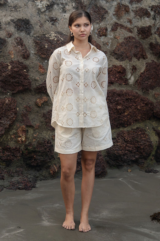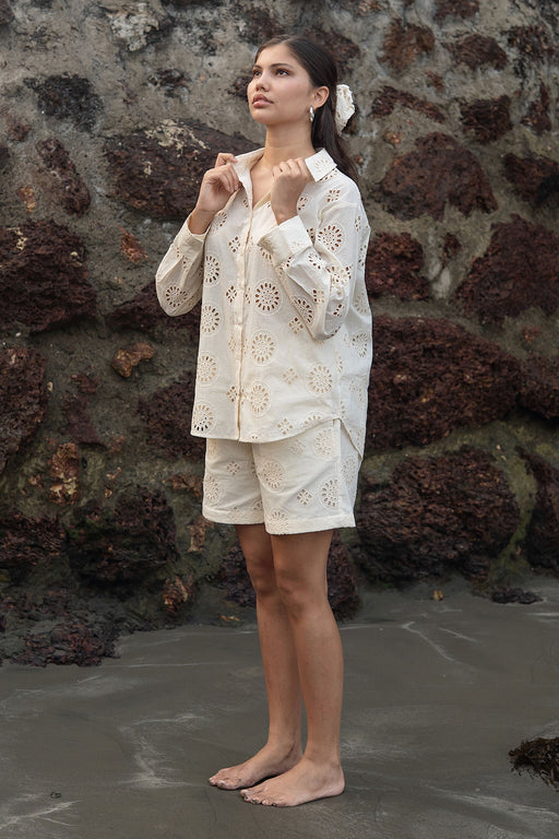 View full detailsDiana set is made from our hakoba embroidered fabric which has a relaxed fit shirt and shorts which is lined with mulmul.Material: Hakoba embroider...