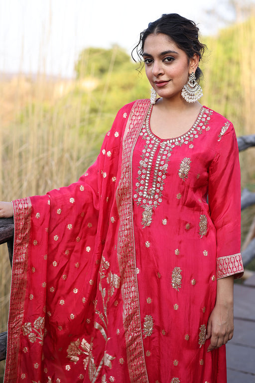 View full detailsElevate your everyday style with our Flamingo Pink Organza Kurta SetÑa perfect blend of silent luxury and soft aesthetics. Expertly crafted from li...