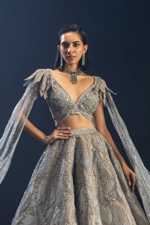 Cloudart Top & Skirt having bejeweled corsages on shoulders and brimming dramatic drapes.