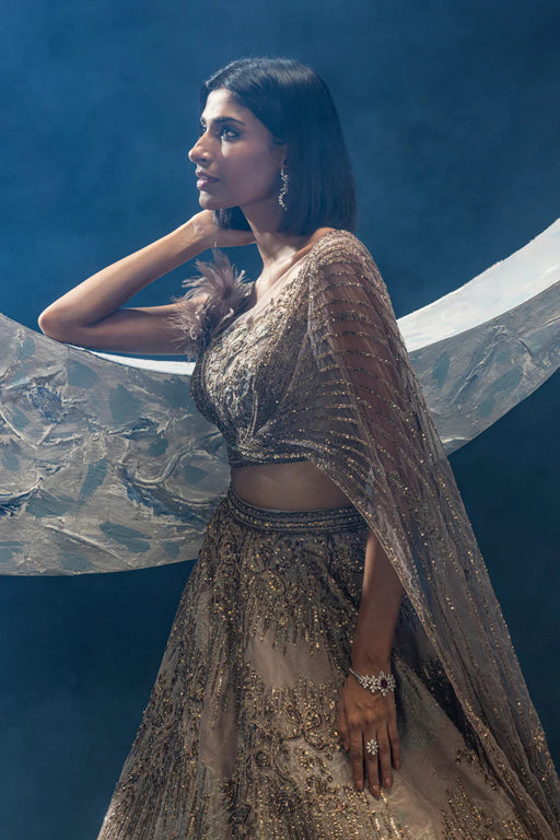 Rose Gold Top with attached dupatta and bejeweled delicately embellished skirt in a linear pattern