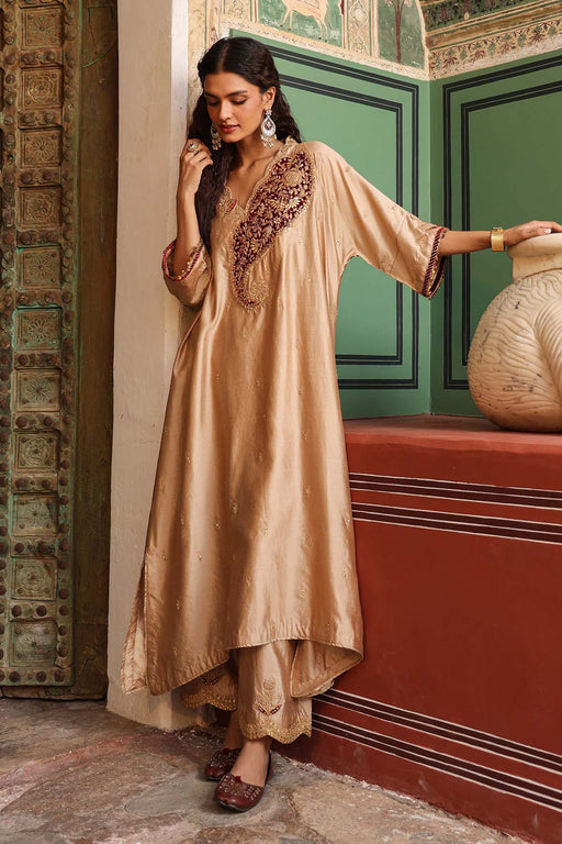 View full detailsThis 2 piece kurta set features heavily embroidered velvet applique paisley along with cutwork neckline and spread of butis all over the kurta. Th...