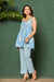 Keep it breezy and beautiful in our Pastel Blue Floral Cotton Co-ord Set, a perfect blend of comfort and contemporary elegance. The sleeveless top comes in a soft blue tone adorned with delicate white floral motifs, a scoop neckline, wooden button accents, and a subtly flared silhouette for added grace.