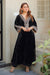 This ensemble is crafted from luxurious pure silk velvet, exuding elegance and sophistication. Adorned with intricate kirandori embroidery and shimmering sitaara, it adds a touch of royal charm. The long kaftan features a bold, deep V neckline at the front, a daring zero back, and flattering three-quarter sleeves. Paired with a traditional Dogri salwar, the entire outfit is beautifully finished with delicate pure tissue fabric and a detailed kinari trim, making it a stunning choice for any special occasion.
