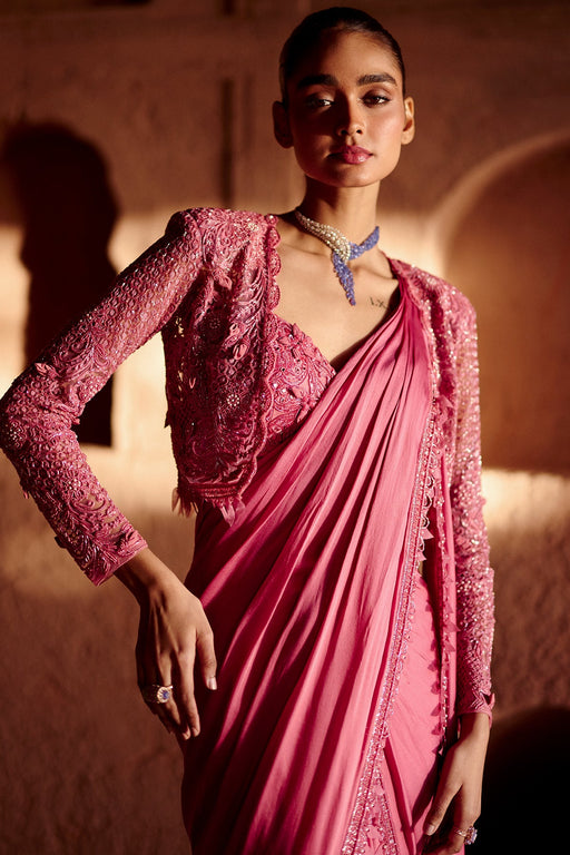 A luxurious Brink Pink draped saree, featuring a sleek fabric texture and adorned with intricate embroidery on the blouse and embellished hems on t...
