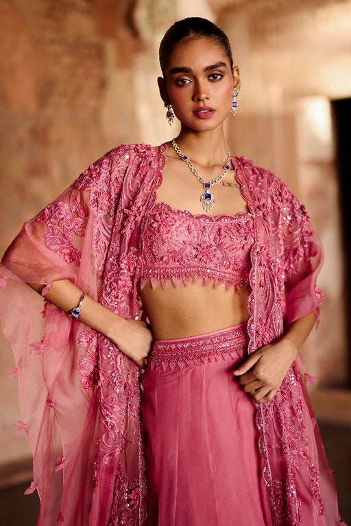 View full detailsElevate your ensemble with our exquisite rose pink fully embellished cape, featuring a structured neckline, paired flawlessly wi...