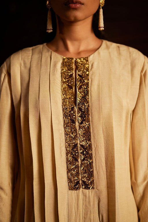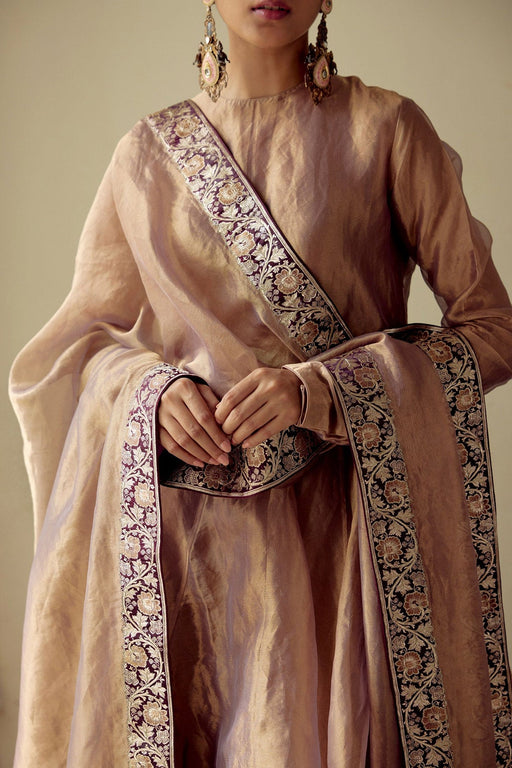 A dreamy kurta set in soft blush pink with a play of fabrics such as a golden aztec print lurex and organza scallop overlays. The kurta features pe...
