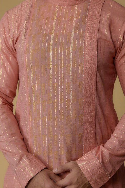 this salmon pink kurta is made in cotton lurex fabric. Block print motifs are placed all over front panel of the kurta. the garment is embellished ...