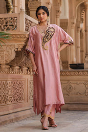This 2 piece kurta set features heavily embroidered velvet applique paisley along with cutwork neckline and spread of butis all over the kurta. The hem of sleeves are embellished with velvet trims and tikki hanging. Pallazo is enhanced with zari embroidery detailing.
