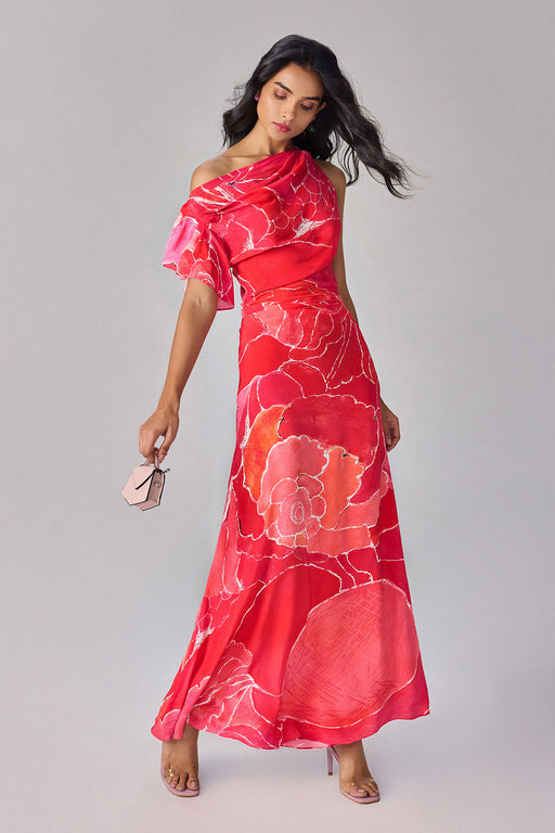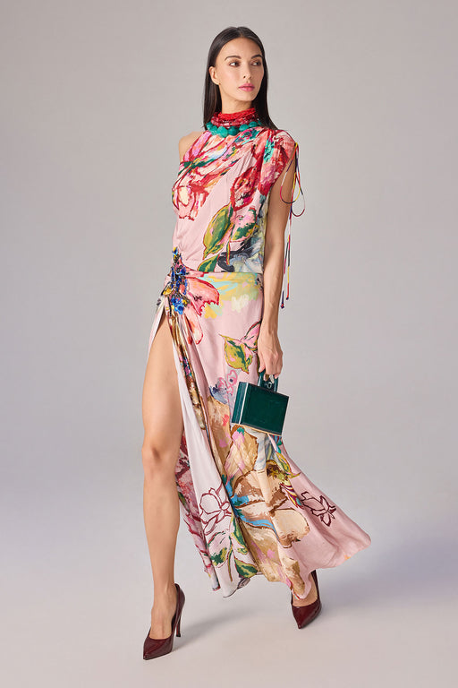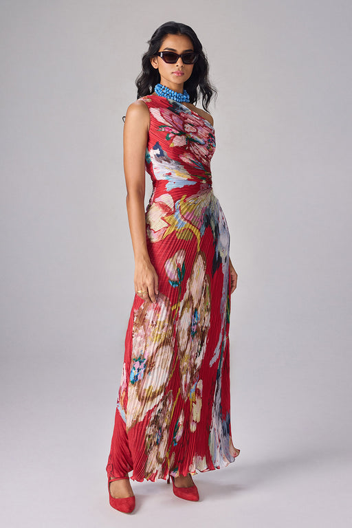 Abstract floral print one shoulder, hand micro pleat maxi dress with side keyhole detailing