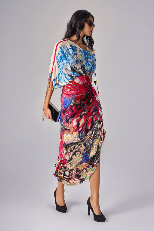 Abstract floral print, hand micro pleat kaftan style dress with adjustable mirror and tassle hand embroidered drawstring sleeves and length