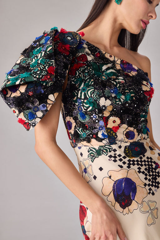 Floral print maxi dress with one shoulder detailing, side ruching, intricate mirrror, coin and tassle hand embroidered side design and customisable...