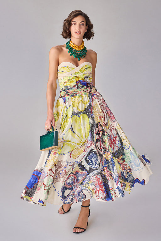 Abstract floral print, midi flared dress with strapless sweetheart neckline and surplice bodice