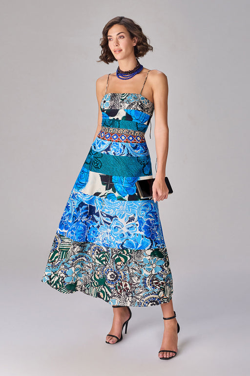 Block print inspired flared midi dress with tie up strap detailing