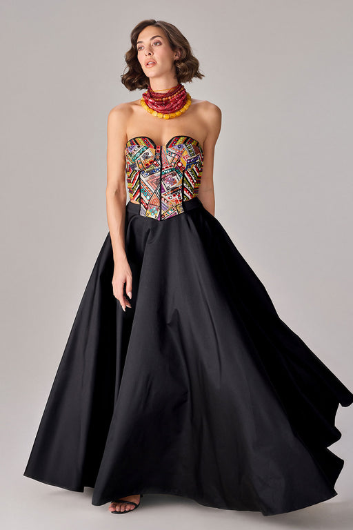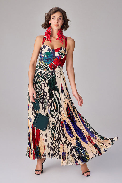 Floral and asbtract print, part hand micro pleat maxi dress with satin bustier and sweetheart neckline