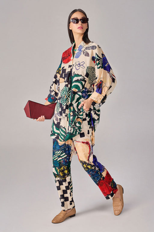 Tunic : Abstract floral and checkered print, asymmetric collared tunic Trousers : Abstract floral and checkered print, high waist trousers