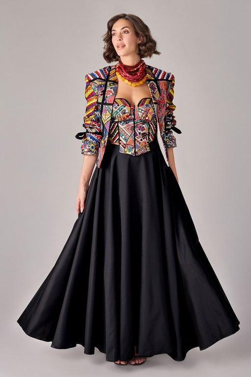 Jacket : Intricate mirror and thread work hand embroidered jacket with tie up sleeves Corset : Intricate mirror and thread work hand embroidered, ...