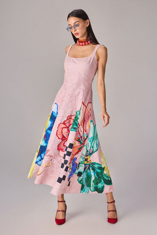 Floral placement print midi flared dress with fitted bodice and square neckline