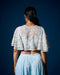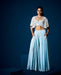Description: This ice blue silk palazzo set has come with two side pockets for palazzo and having pearl embroidery paired with heavy pearl & cutdana work deep neck netted blouse including cape.