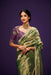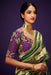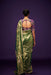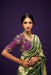 Product description: The emerald green saree features a vibrant shade of green, which ranges from emerald to olive, and is beautifully complemented by gold accents. As for the blouse, the grape purple creates a striking contrast and is intricately embroidered.