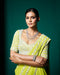 Description: This pollen yellow georgette drape saree has pearl work all over the pallu and paired with heavy pearl & cutdana work sweetheart neck line blouse.